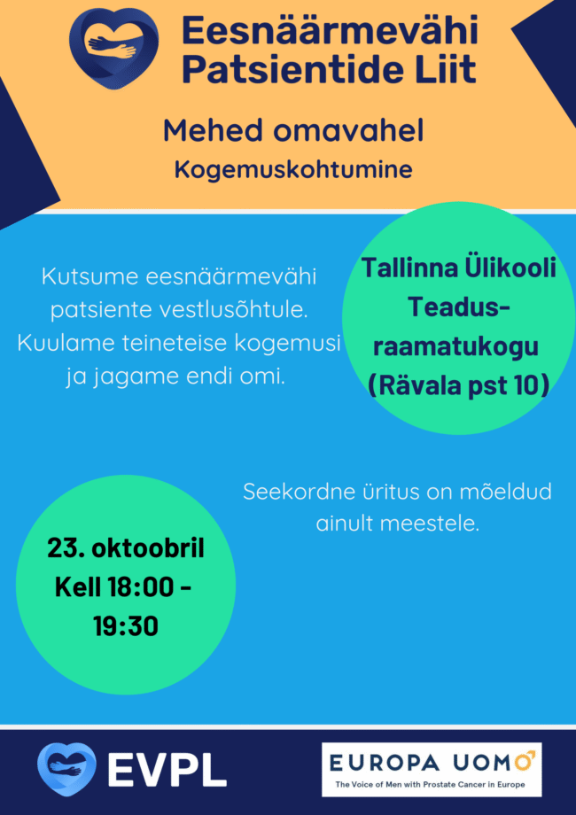 Saame kokku 22.11.2025 infopäeval “Koos eesnäärmevähi vastu” Nordic Hotel Forumis, ürituse algus kell 12:00, osalemine tasuta!Esinevad onkoloog Mikk Saretok, androloog Kristjan Pomm ja EVPLi juhatuse liige Sven Suurraid. Peatse kohtumiseni!