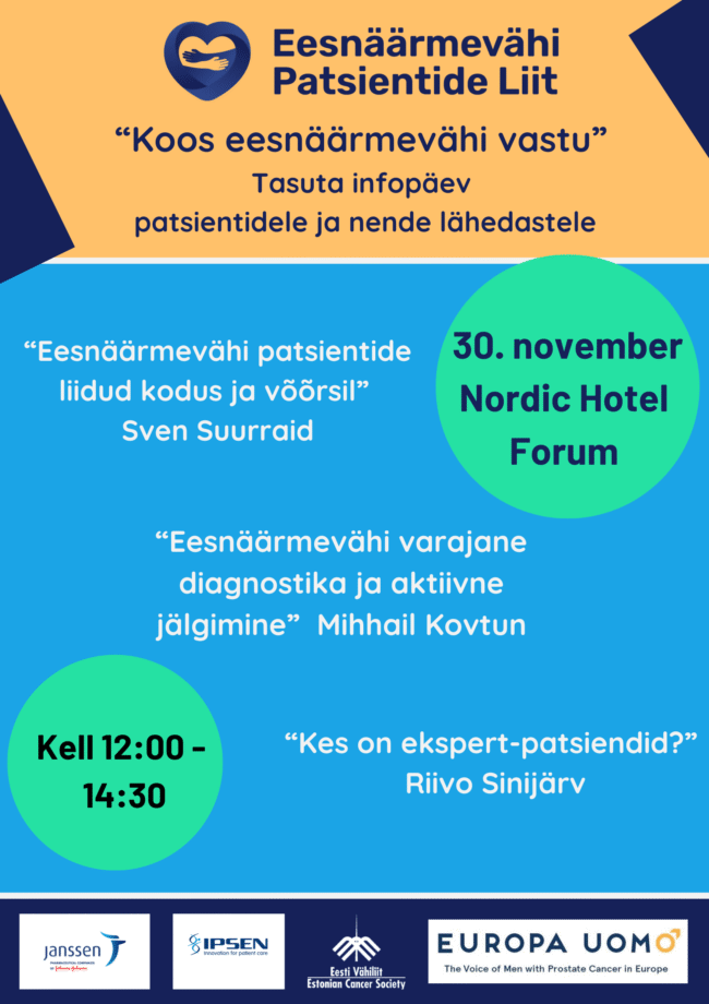 Saame kokku 22.11.2025 infopäeval “Koos eesnäärmevähi vastu” Nordic Hotel Forumis, ürituse algus kell 12:00, osalemine tasuta!Esinevad onkoloog Mikk Saretok, androloog Kristjan Pomm ja EVPLi juhatuse liige Sven Suurraid. Peatse kohtumiseni!